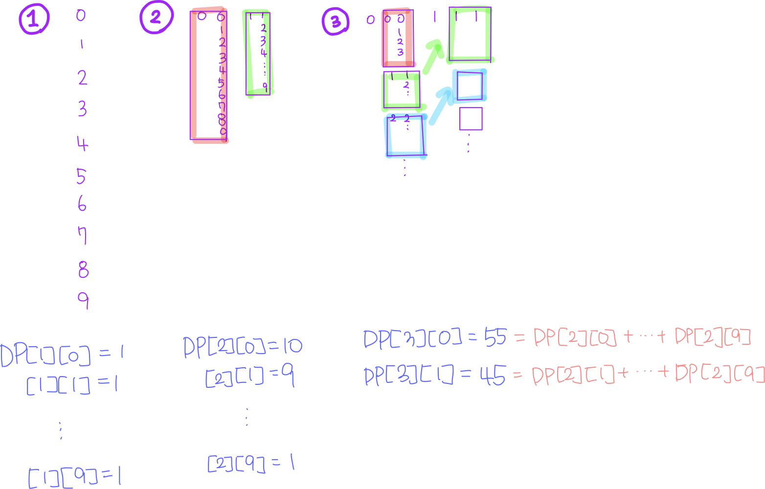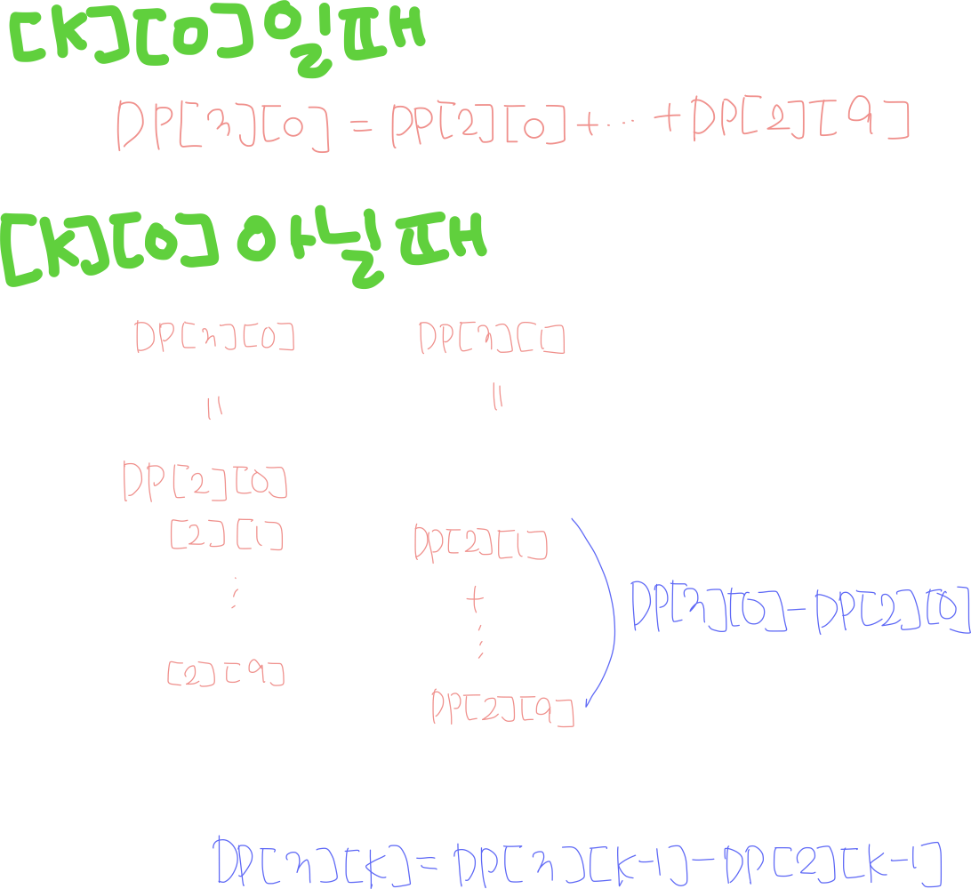위의 그림에 의해, dp[k][0] = dp[k-1][0] + dp[k-1][1] + dp[k-1][2] + ... + dp[k-1][9]