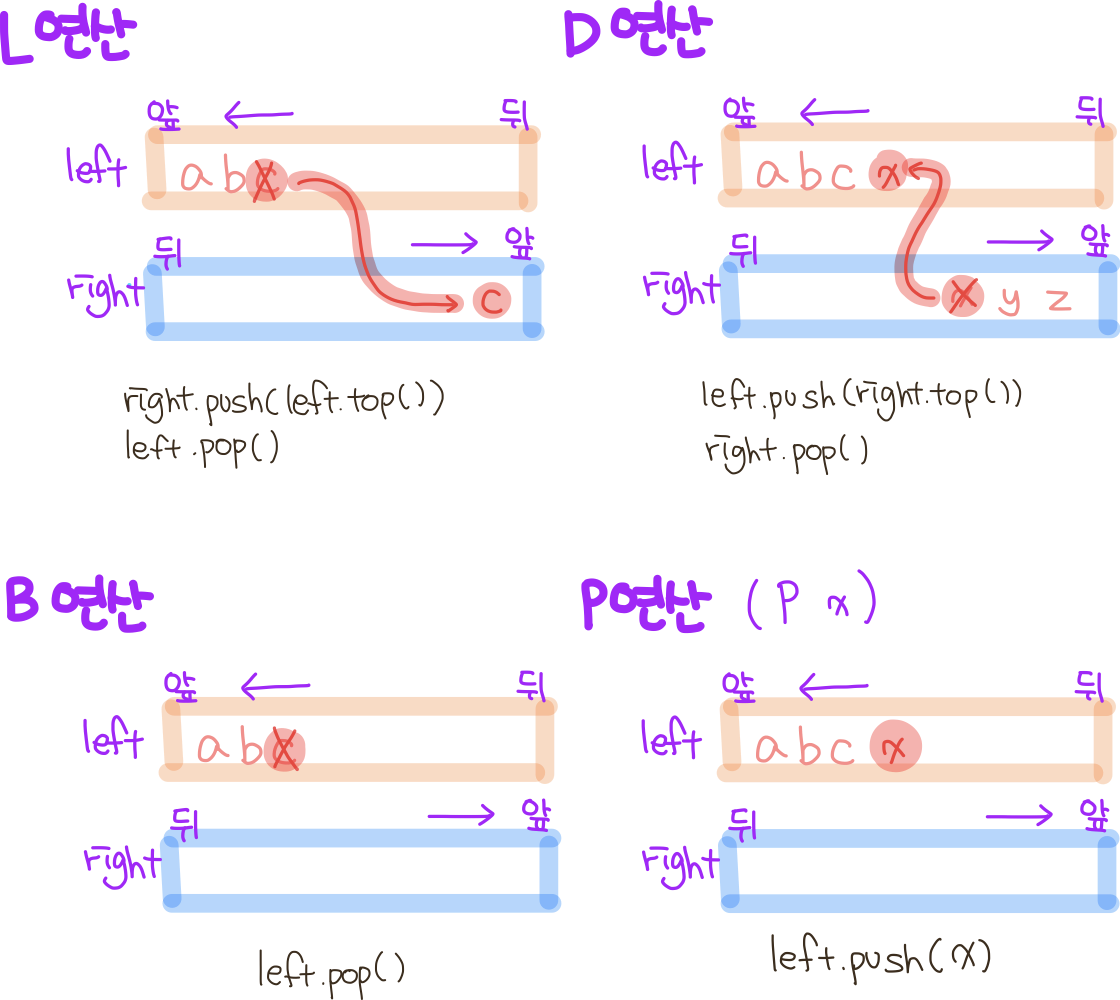 문자열에서 커서를 이동하고 중간에 문자를 삽입하는 과정을 쉽게 만들기 위해 stack 두개를 사용하였습니다.