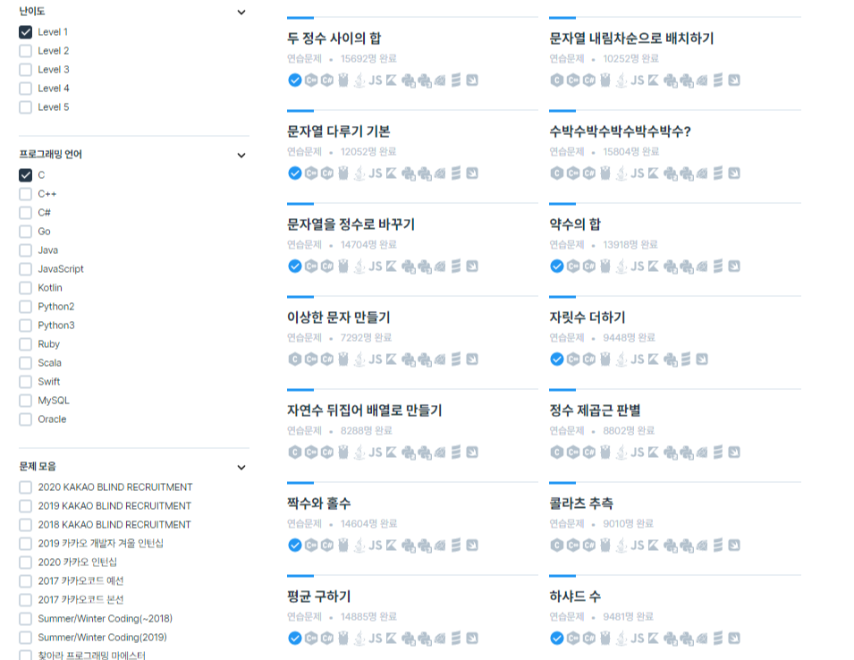 프로그래머스는 다양한 난이도와 언어를 필터과정을 통해 쉽게 골라내 자신이 원하는 문제만을 풀어볼 수 있고 카카오 / 네이버 / 라인 등 다양한 대기업의 코딩테스트가 실제로 이루어지는 사이트로 미리 사이트에서 코딩을 해보는 경험을 해본다면 실제 코딩테스트에서 많은 도움이 될 것이라 생각합니다.