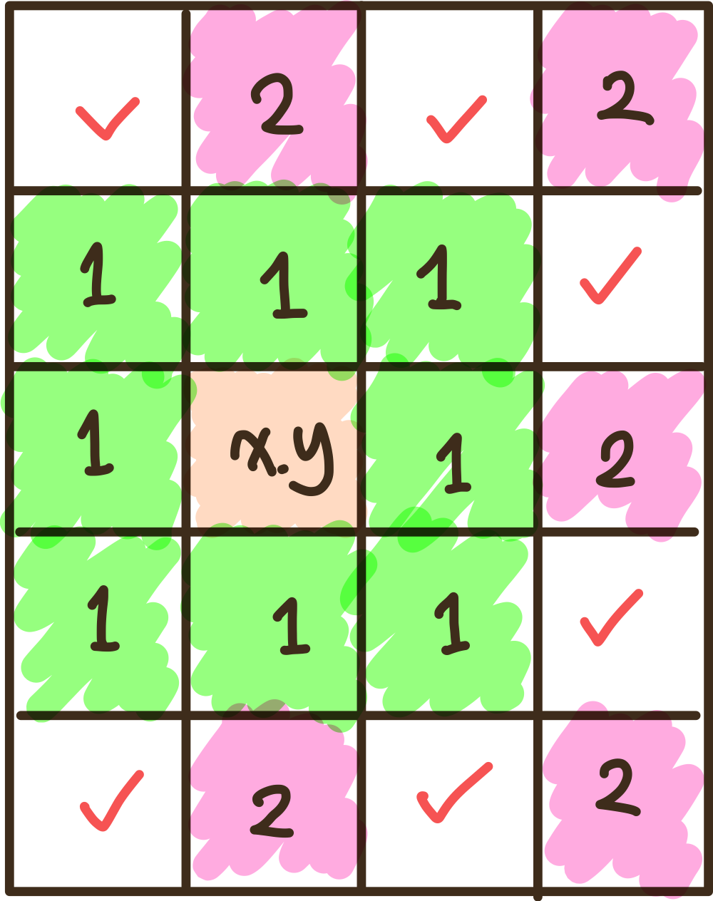 - nx = x + dx[i] *2, ny = y + dy[i] *2