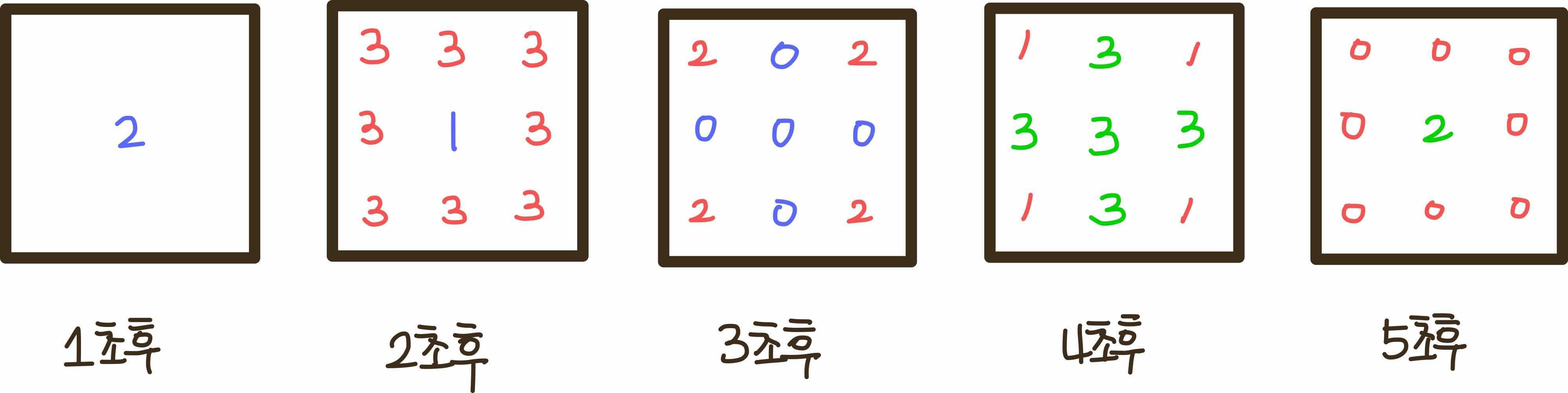 - 다음 1초 동안 폭탄이 설치되어 있지 않은 모든 칸에 폭탄을 설치하고 폭탄의 시간이 0이 된 폭탄은 폭발한다.