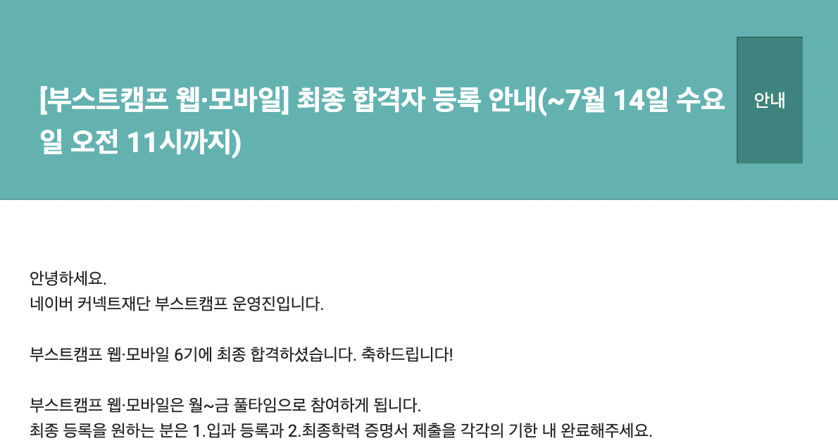 7월 13일 4시 30분쯤 최종합격 메일을 받았습니다! 🥰🥰 (코테 후기 쓰면서.. 처음 최종합격인듯 ㅎㅎ)