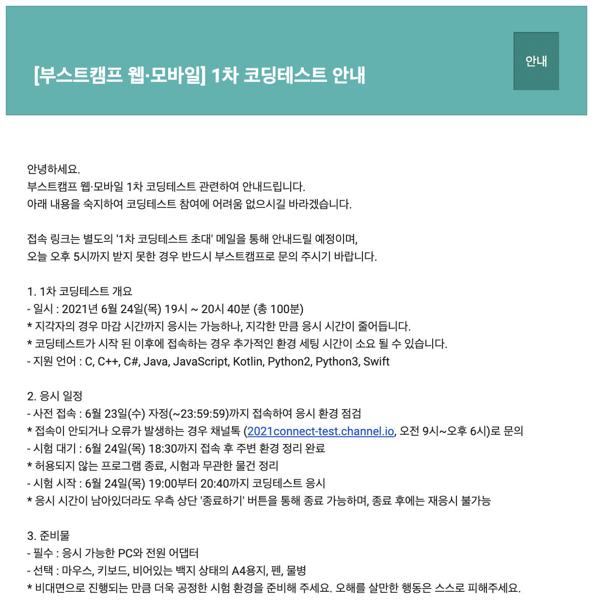 시험을 보기 하루전 아래와 같은 안내 메일을 받았고