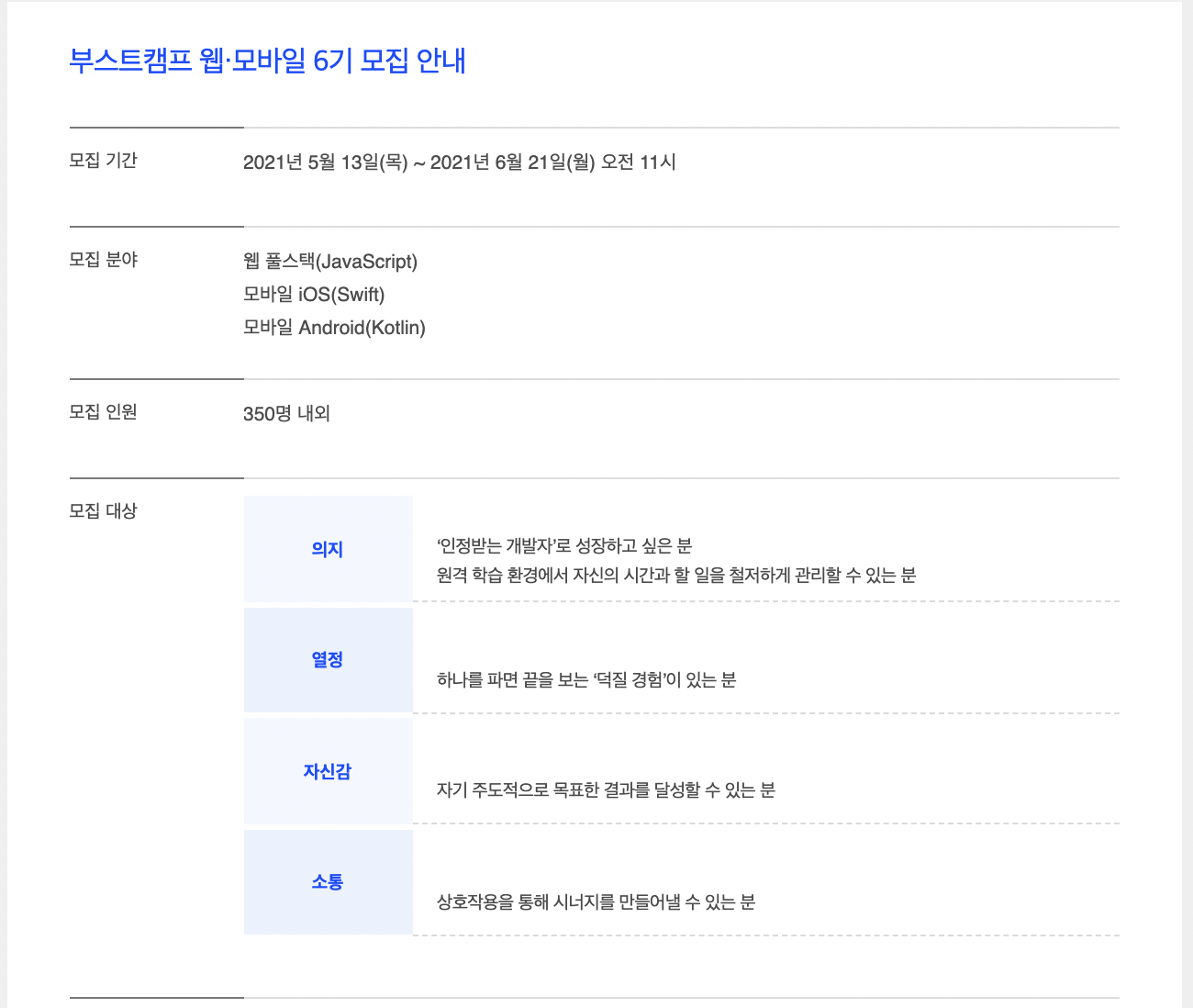 | 부스트캠프 웹모바일 6기 챌린지 수료 & 멤버십 합격 후기 (0) | 2021.08.16 |