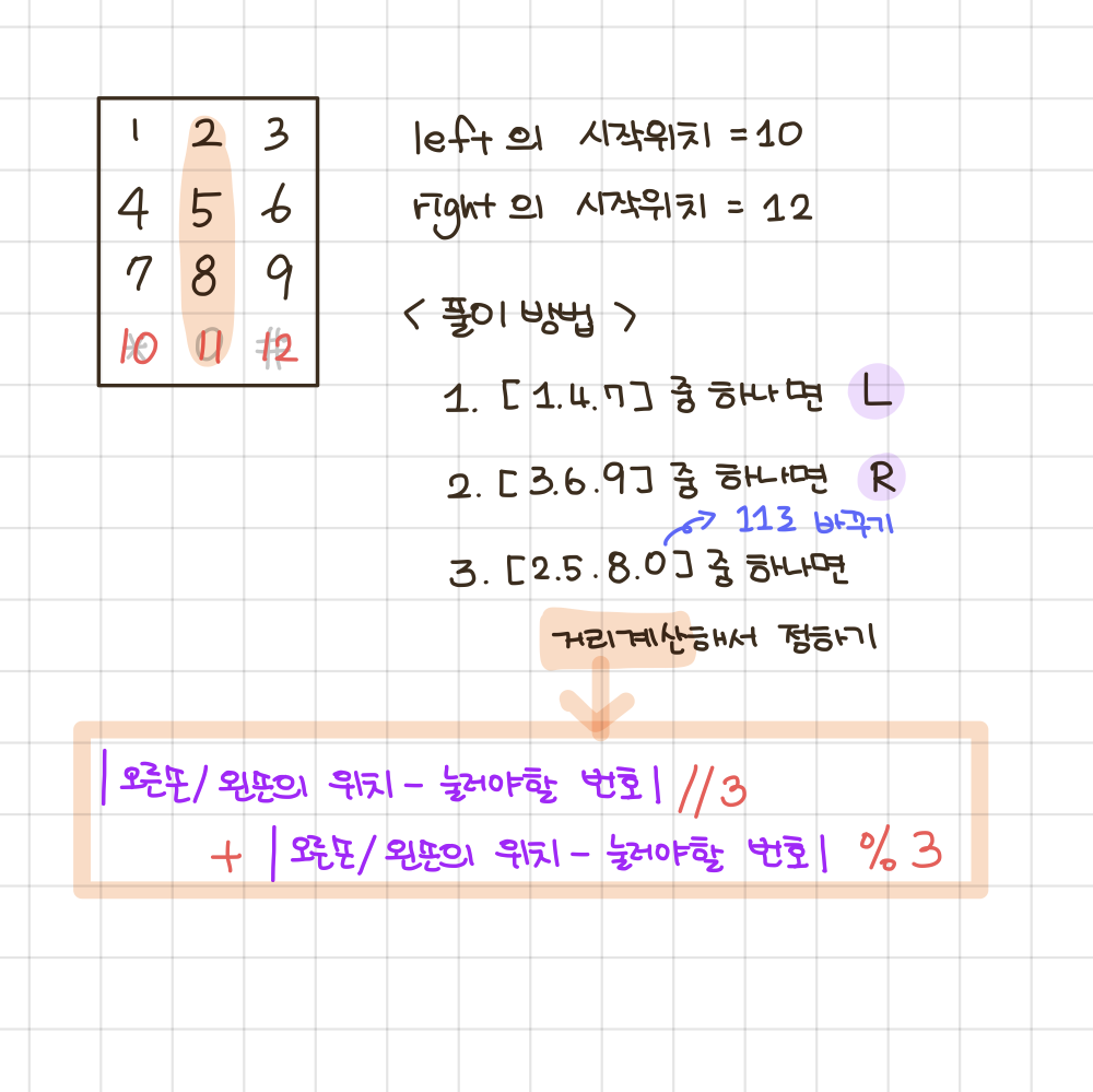 | 4 | 9 | 5 | L | 왼손 거리는 1, 오른손 거리는 2이므로 왼손으로 5를 누릅니다. |