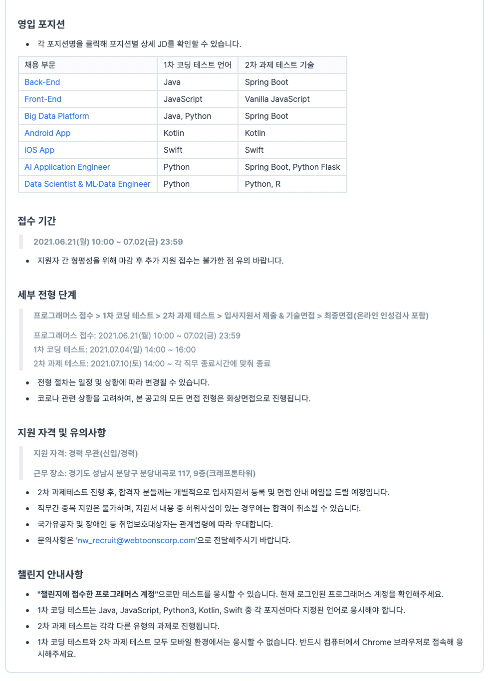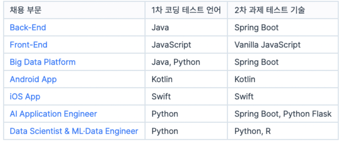 - 코딩테스트언어는 채용 부문에 따라 언어가 정해져 있습니다