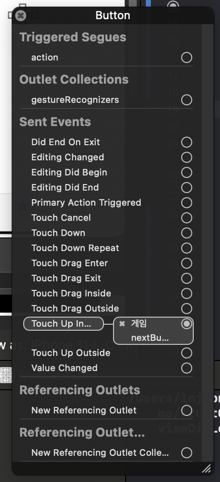button > 오른쪽 마우스 클릭을 통해 현재 버튼이 Outlet 과 Action 이 중첩되서 선언되지는 않았는지 확인해보세요!