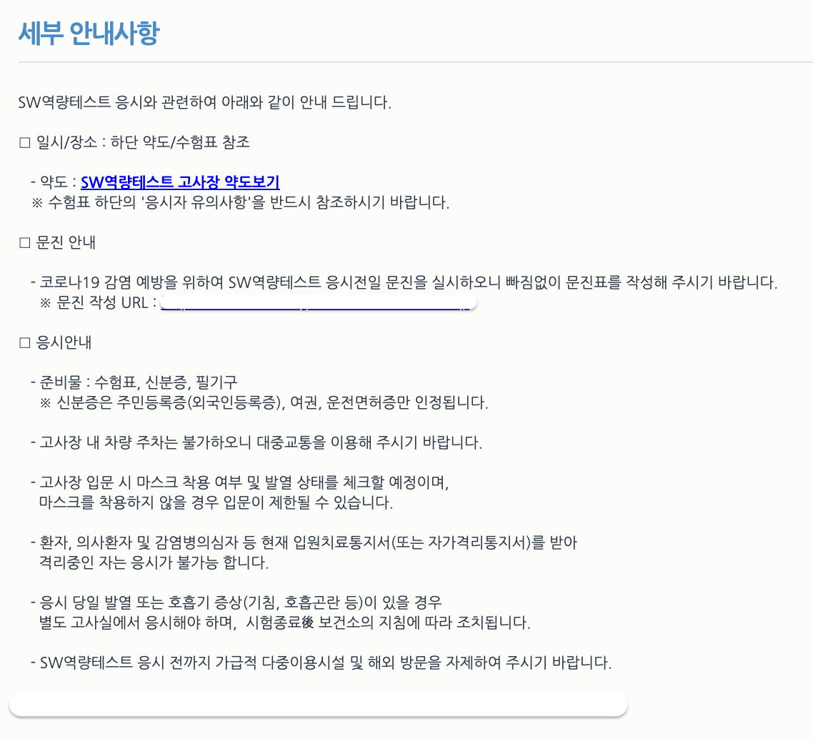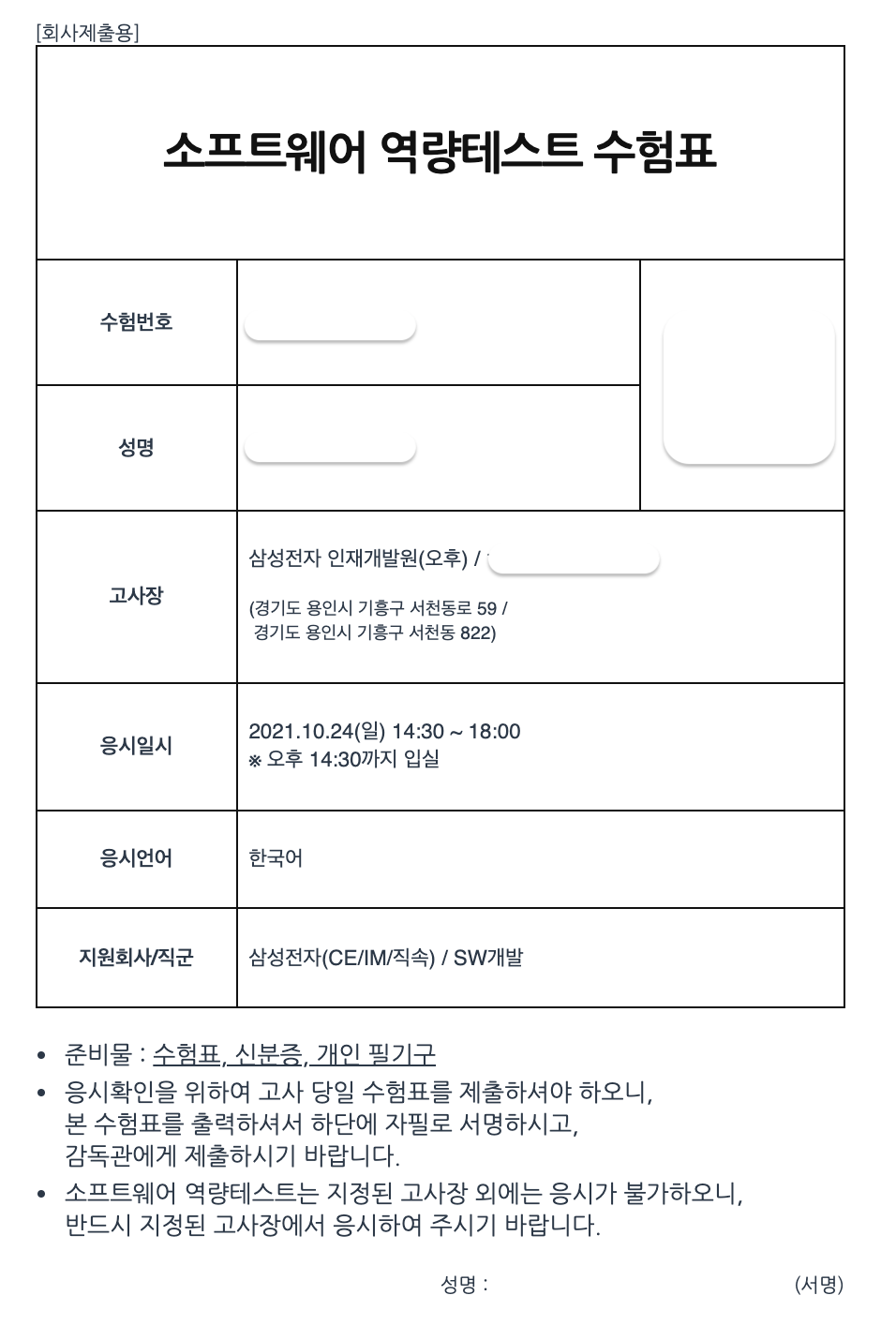 시험 볼 장소와 시험장 번호 등 상세 정보는 코딩테스트 5일전인 10월 19일에 채용사이트에서 확인할 수 있었습니다.