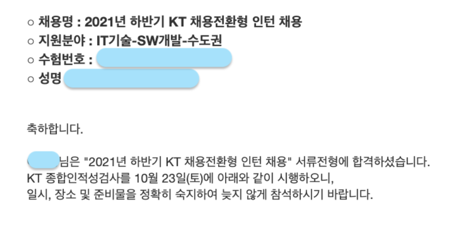 자소서는 9월 27일에 마감되었고 서류전형 결과는 14일 뒤인 10월 13일에 kt 채용 홈페이지에 발표되었습니다.