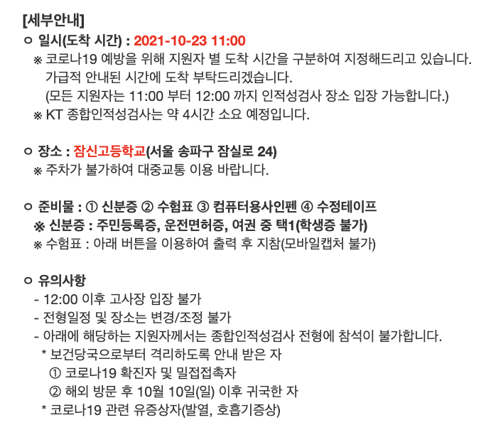 시험 전 입실시간은 11시~12시였으나 코로나로 인해 수험생들마다 도착해야되는 시간이 정해져 있었습니다.