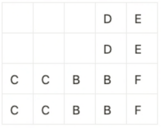 ["CCBDE", "AAADE", "AAABF", "CCBBF"] → [[C, A, A, C], [C, A, A, C], [B, A, A, B], [B, B, D, D], [F, F, E, E]]