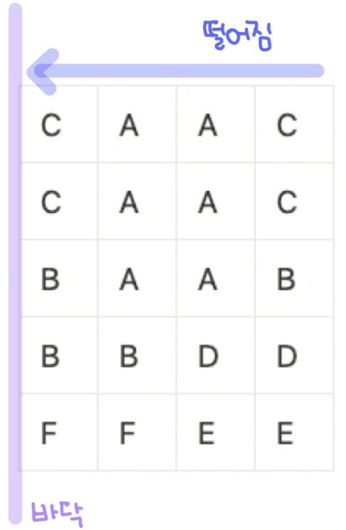 - board는 길이 n인 문자열 m개의 배열로 주어진다. 블록을 나타내는 문자는 대문자 A에서 Z가 사용된다.