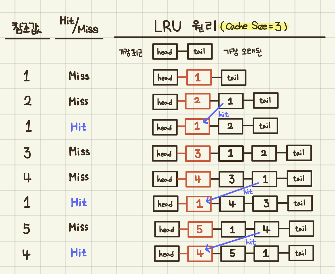 LRU를 구현할때는 Doubly Linked List 를 사용하고 head 에 가까운 node 일수록 가장 최근에 참조된 페이지, tail 에 가까운 node 일수록 가장 오랫동안 참조되지 않는 페이지입니다. LRU 의 개념에 따라 cache size 를 넘어서게 된다면 tail 에 가까운 페이지가 먼저 삭제되도록 합니다.