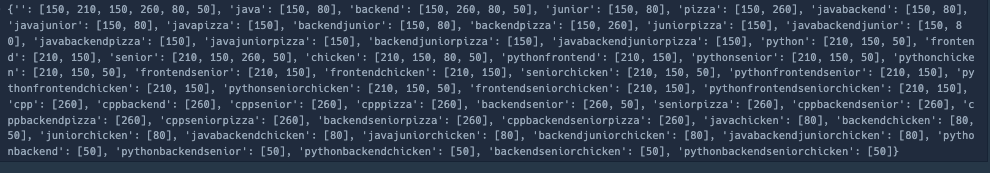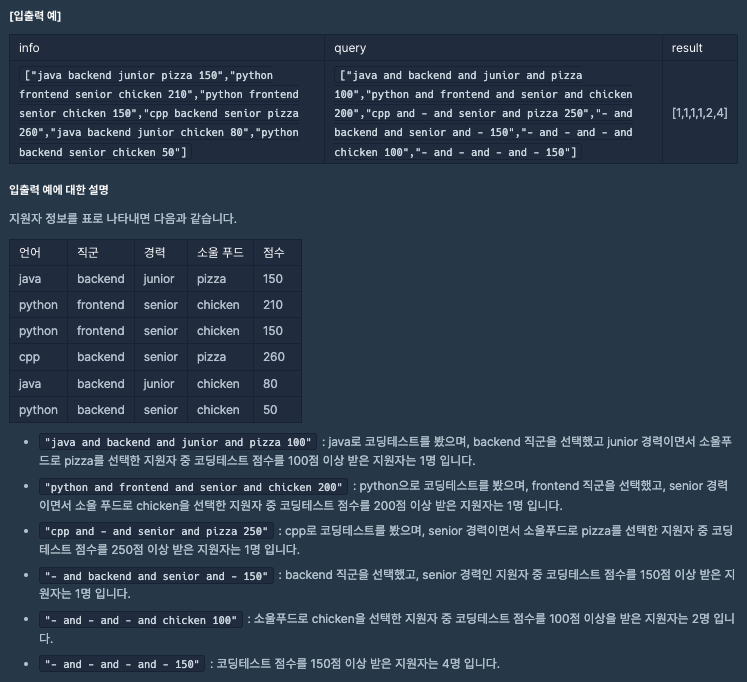 | 입력값 〉 | ["java backend junior pizza 150", "python frontend senior chicken 210", "python frontend senior chicken 150", "cpp backend senior pizza 260", "java backend junior chicken 80", "python backend senior chicken 50"] |