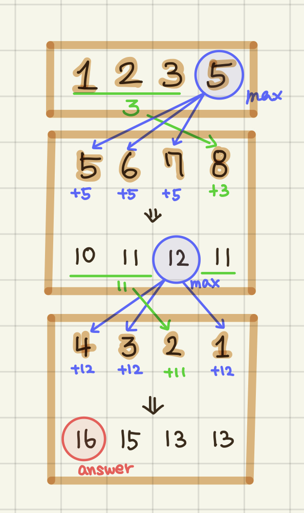 n행에서 maxIdx 와 같은 위치에는 secondMaxNum을, 나머지에는 maxNum을 더합니다.