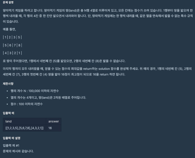 땅따먹기 게임을 하려고 합니다. 땅따먹기 게임의 땅(land)은 총 N행 4열로 이루어져 있고, 모든 칸에는 점수가 쓰여 있습니다. 1행부터 땅을 밟으며 한 행씩 내려올 때, 각 행의 4칸 중 한 칸만 밟