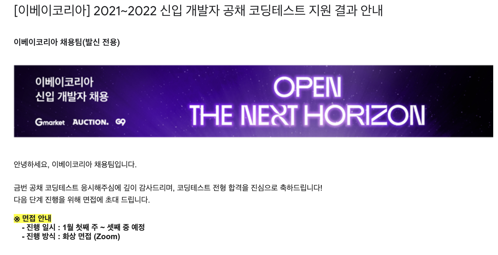 코딩테스트 결과는 4일뒤인 1월 3일에 메일을 통해 안내되었습니다. (채용과정 너무 빨라서 좋아요 😺)