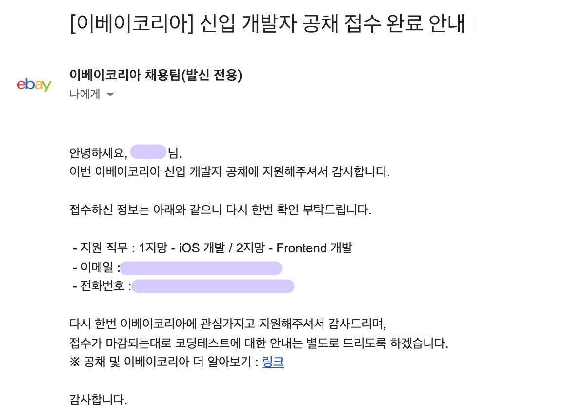신청을 완료하면 몇분뒤에 메일이 도착해 다시한번 확인할 수 있습니다! (신청이 안됬으면 어쩌지... 하는 취준생의 마음을 알아주시는 인사팀의 작은 배려..ㅎㅎ 너무 감사합니다👍)