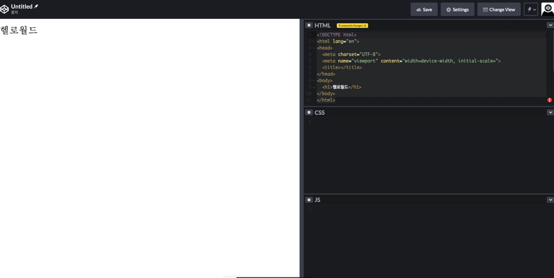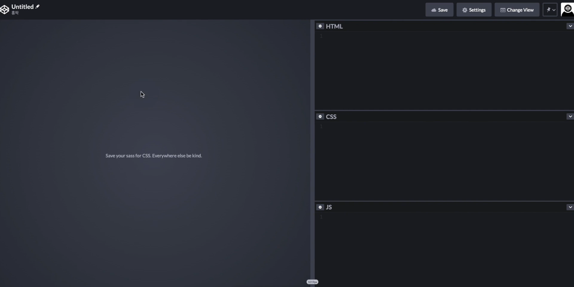 위의 화면에서 우측의 HTML, CSS, Javascript 영역에 코드 작성시 왼쪽 화면에 바로 시각적으로 확인 가능
