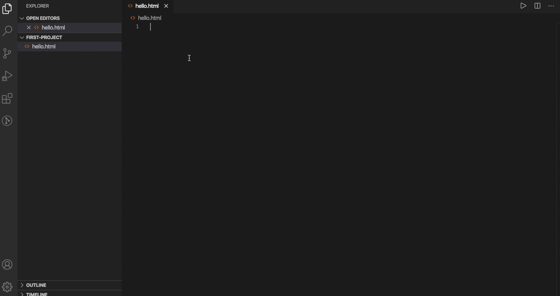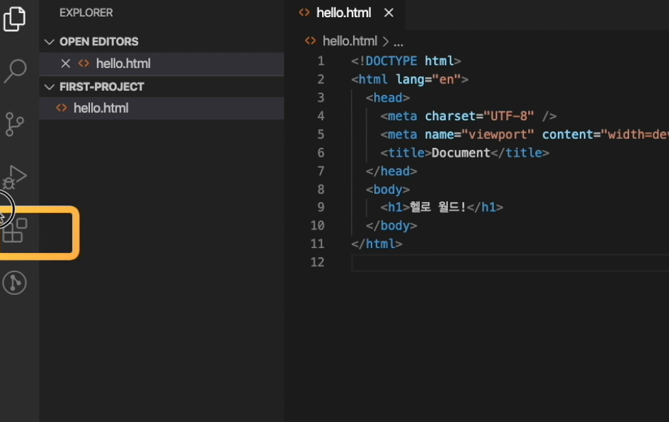 왼쪽 상단에 파일표시 클릭 - Open Folder - New Folder - hello.html 파일 만들기