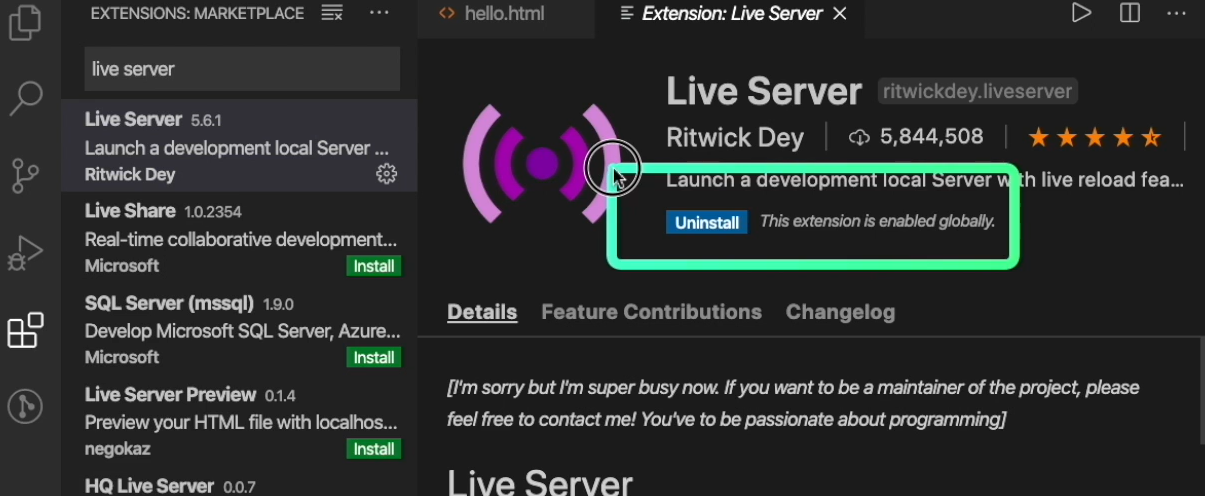 B. Vscode 내의 확장 프로그램 (노란색 상자) - Live Server 설치 - hello.html 파일 우클릭 - Open with Live Server 클릭