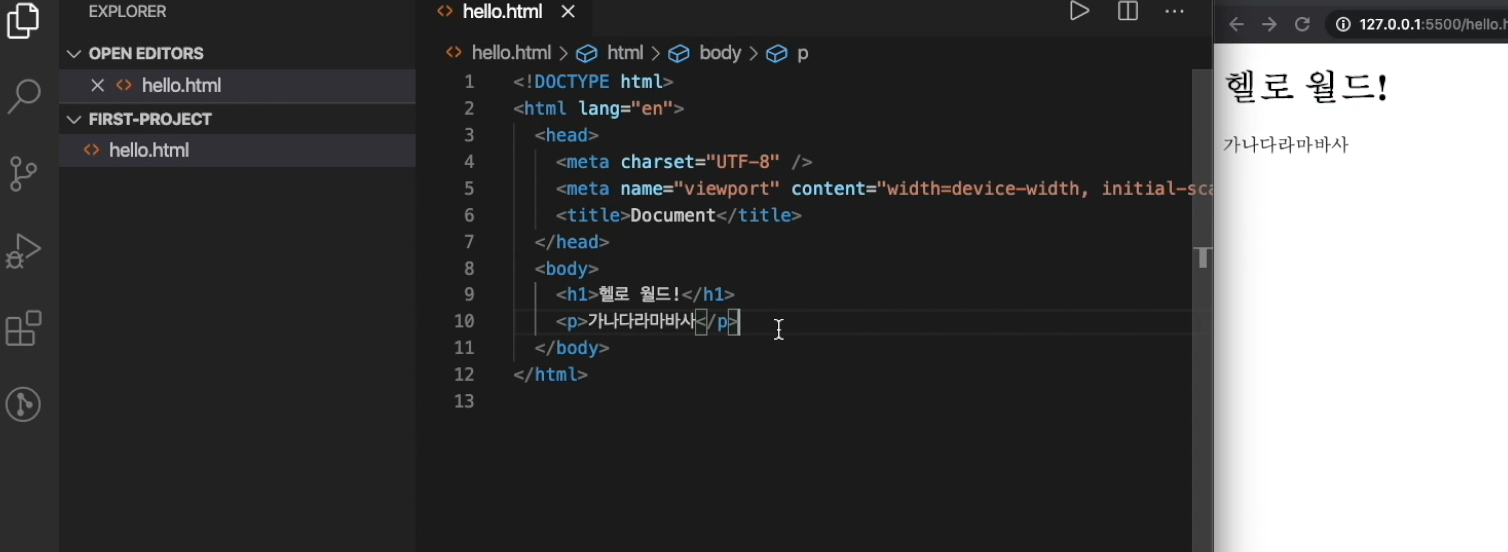 A. <h1>헬로월드<h1> 작성후 chrome 브라우저 열기(ctrl+o -> 파일클릭) - 내가 만든 문서 확인