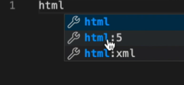 html 작성 뒤 2번째 " html : 5 "을 선택하여 자동완성기능 사용하기